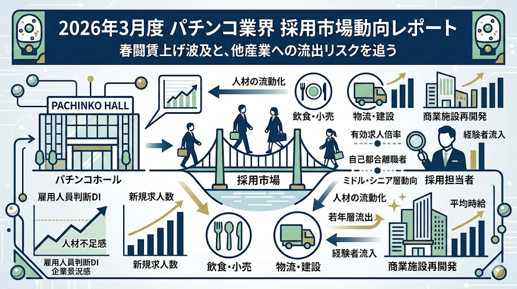 2026年に入り、雇用市場は「防衛的賃上げ」のフェーズへと完全に移行しました。2026年春闘では、日本ガイシ(6.86%増)や第一生命HD(約7%増)など、歴史的なベースアップ回答が相次いでいます。日銀短観の雇用人員判断DI(非製造業)は▲46と深刻な人手不足を示しており、サービス業全般で「賃上げを行わなければ事業継続が困難」という認識が浸透しています。大手外食・小売チェーンが初任給を30万円台に引き上げる動きを加速させており、パチンコホール業界の「高給与」という優位性がさらに低下する局面を迎えています。